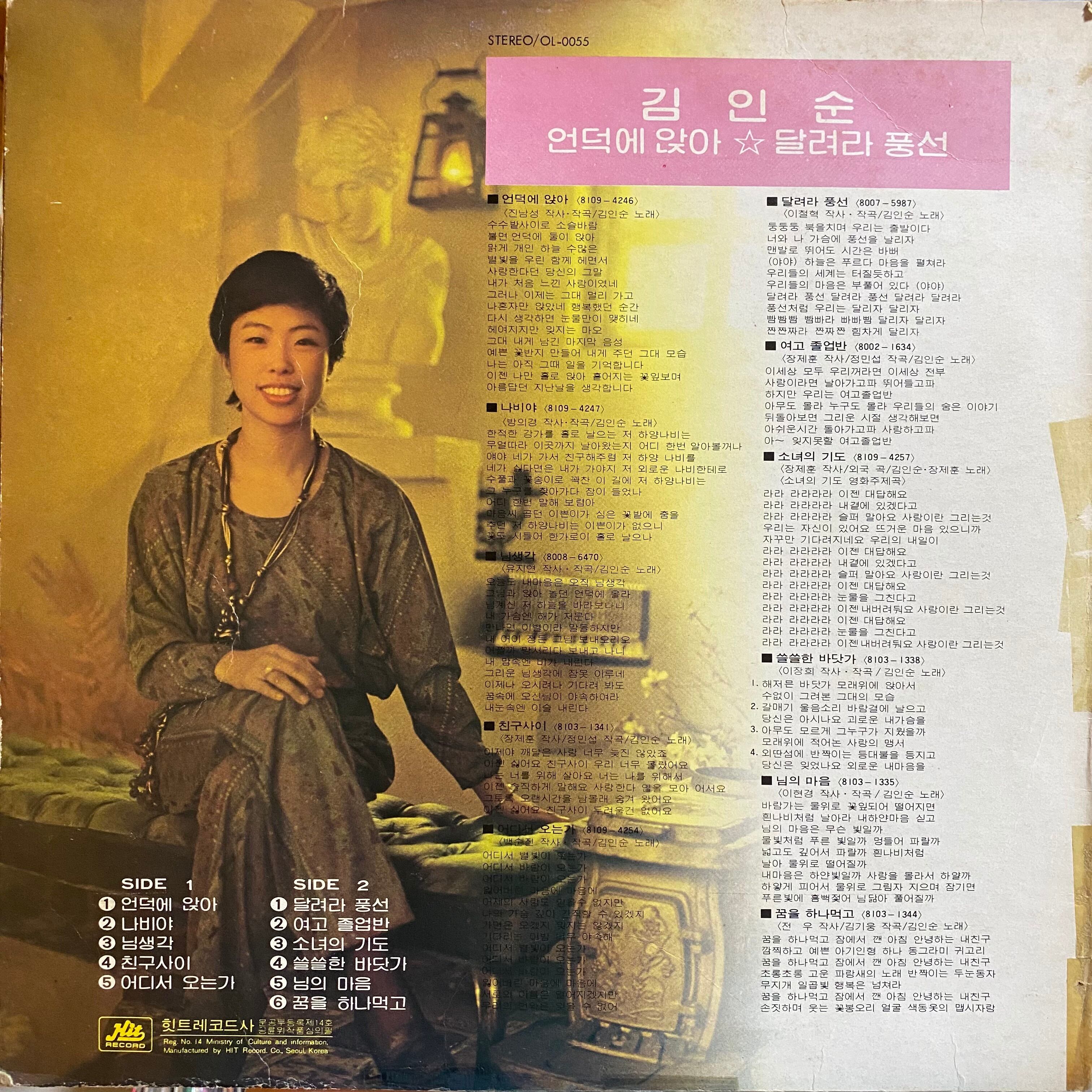 Comment : 75年頃映画主題歌の女校卒業班の記録的大ヒットで一世を風靡した故・キムインスンの81年ラストアルバム。B3ニムセンガッ(あなたを思う)はじめナイスメローポップス収録!