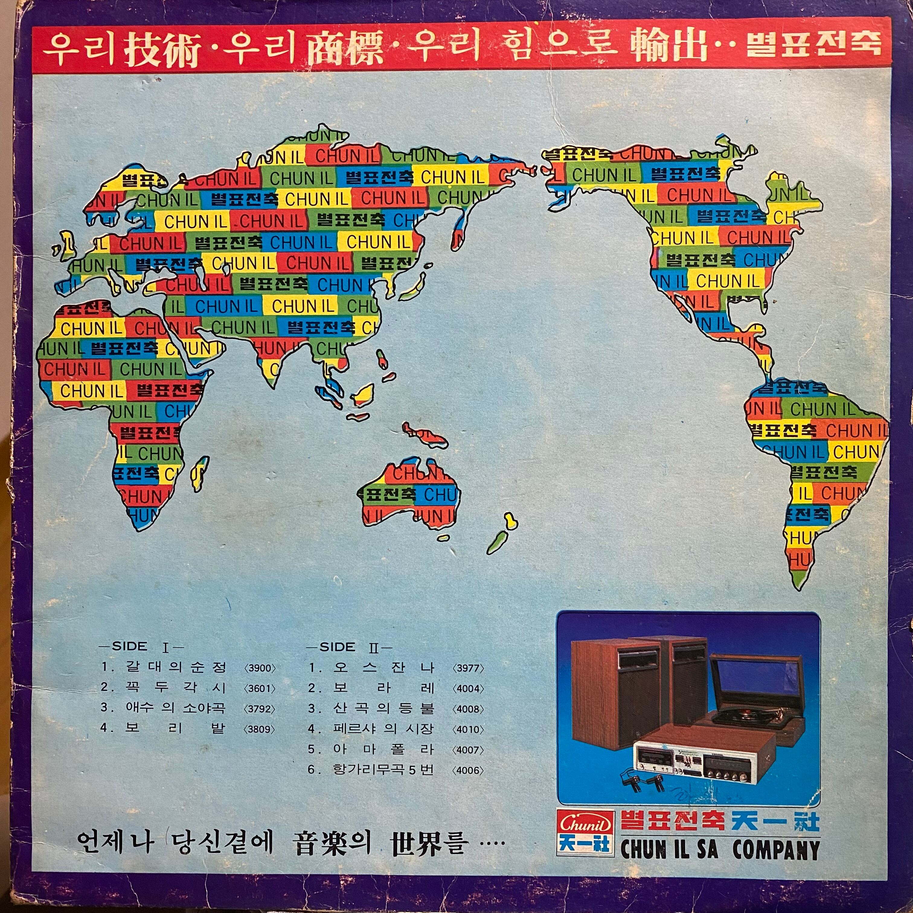Comment : Chunil 星票電蓄の会社紹介レコード。カルッテエスンジョン(葦の純情)にナレーションを載せた会社紹介や、B4イントロにドラムブレイクを収録した”ペルシャの市場”カバー他打っているGoGoファンク・ロック多数収録の良盤です。