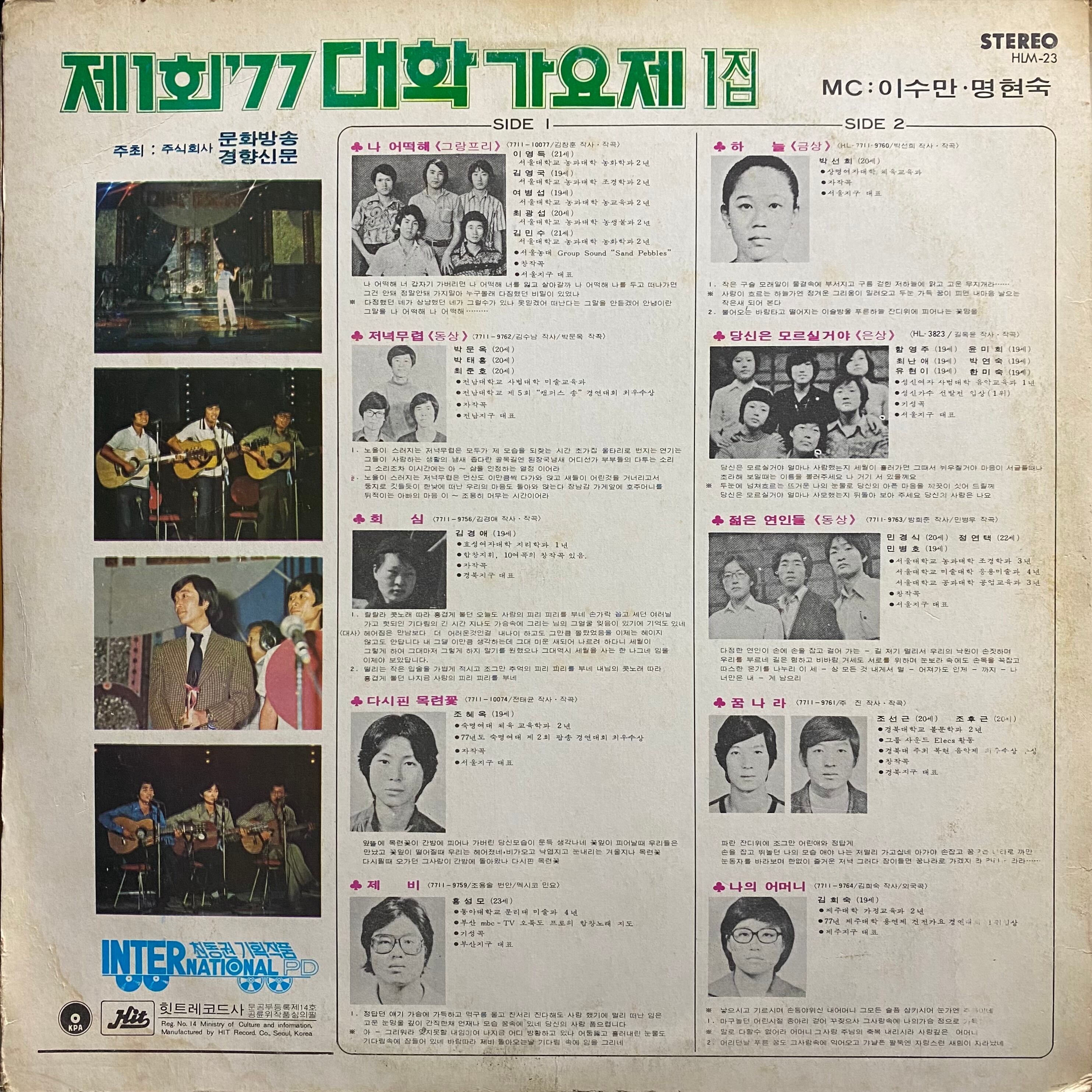 Comment : 77年に韓国ソウルで行われた大学音楽際のライブ録音レコード。