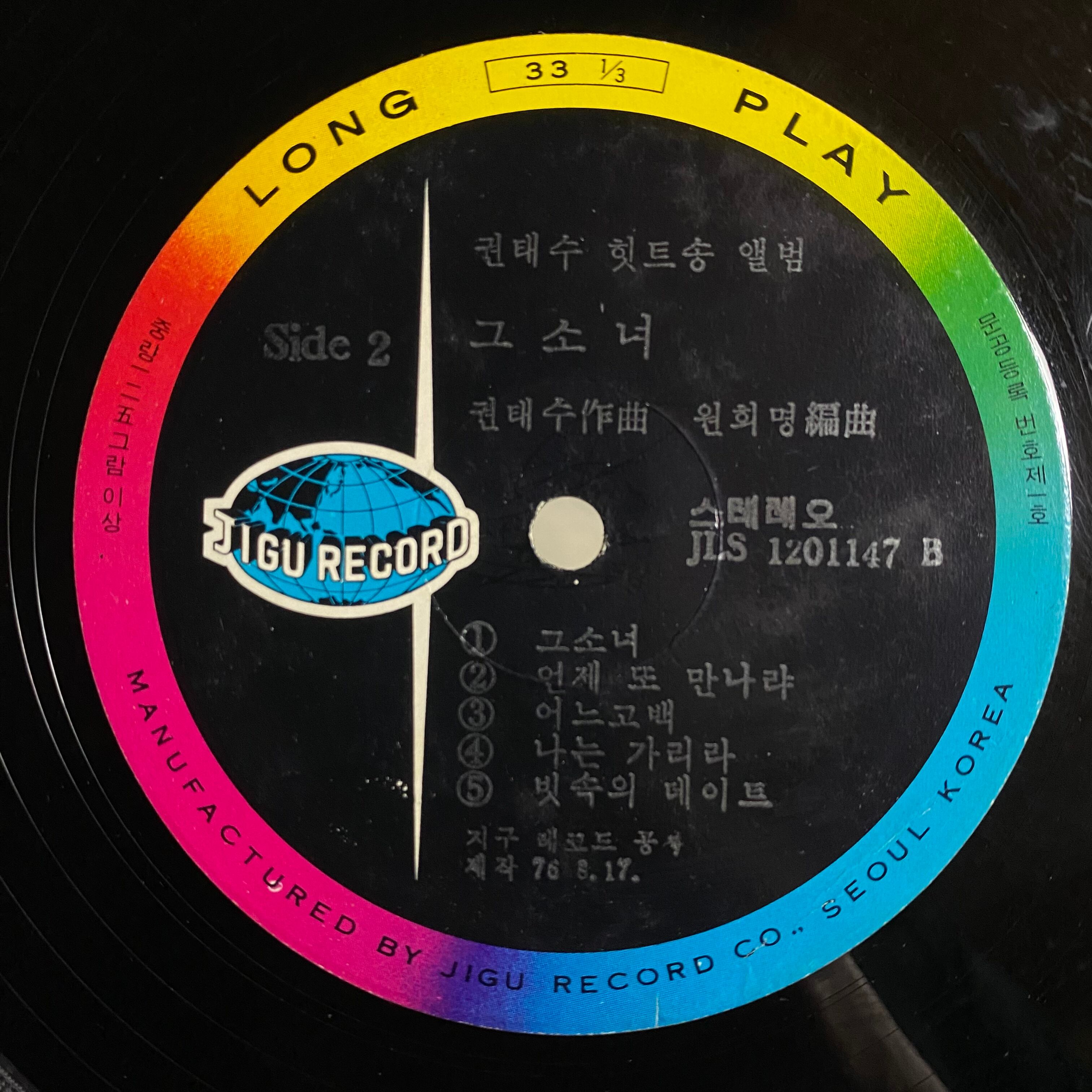 Comment : 74年から歌手活動をスタートし、76年に本アルバムをリリースTBC(東洋放送)でA1”ヌヌロ(目で)“を歌い新人歌手賞を受賞したクォンテス。収録のファンキー歌謡A4”パパ”、B“オヌコベク(ある告白)”等オススメです!