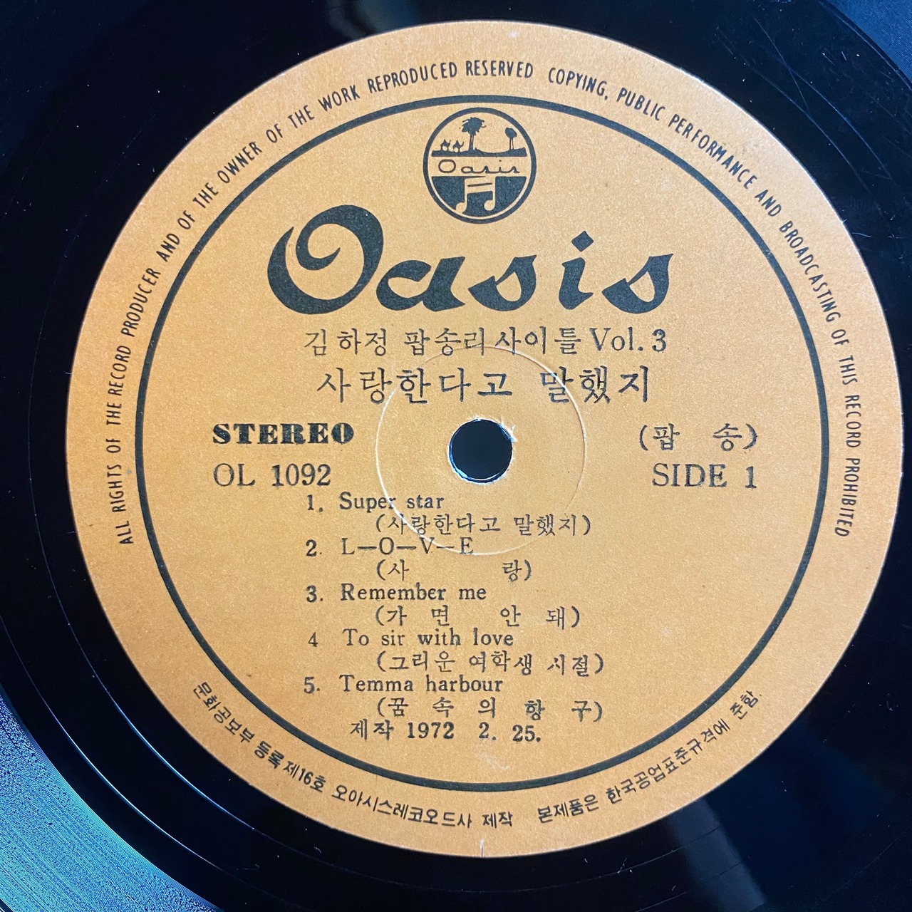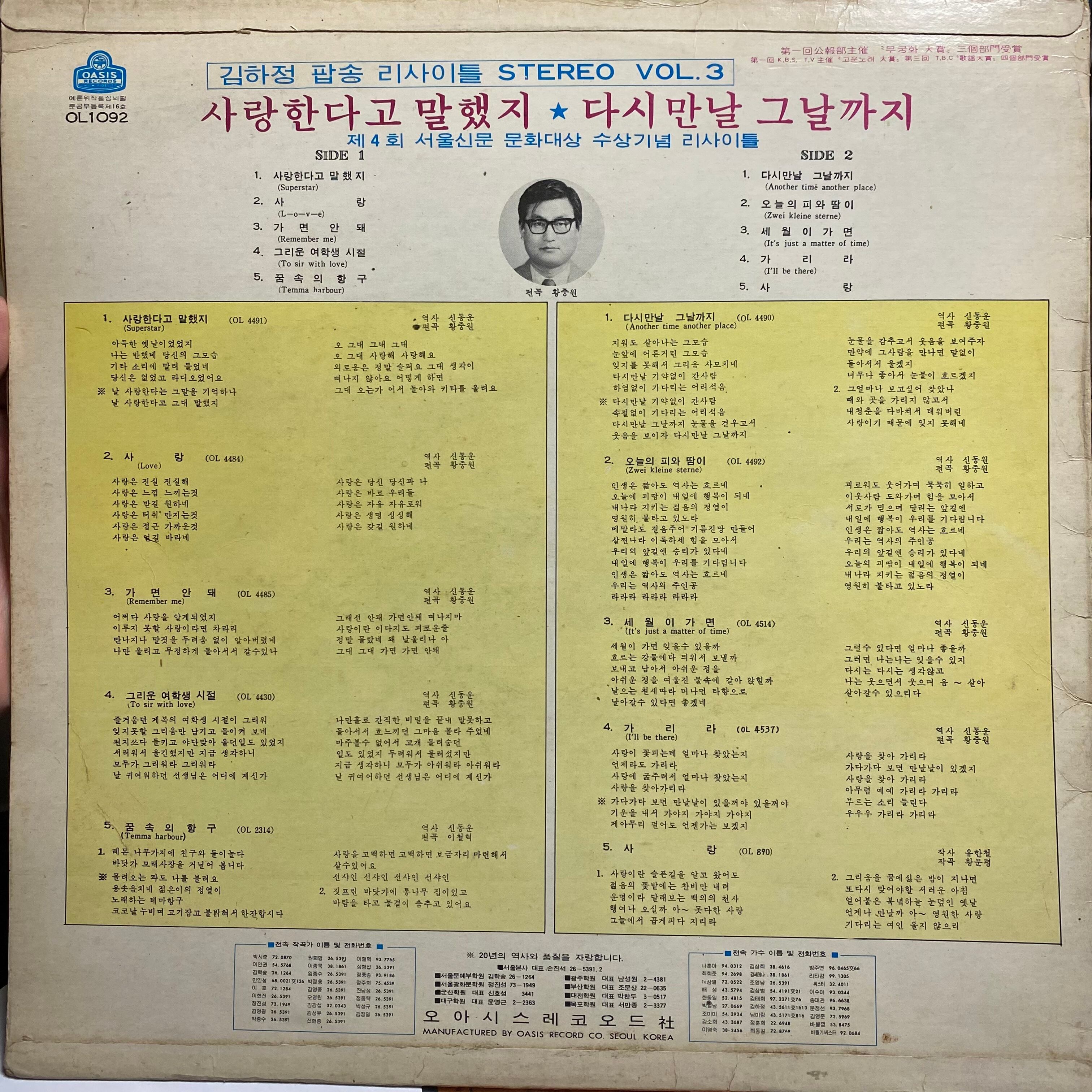 Comment : 70年代に活躍した韓国のミュージカル俳優・フィーメル歌手。サラン(愛)、クムサンアガッシ(金山お嬢さん)などのヒットチューンで注目を集め、1971年頃MBC10代歌手特別賞、ソウル新聞女性歌手賞等を受賞したことで知られるキムハジョンの72年作。タイトルにリサイタルとありますがライブ録音盤ではありません。英米圏のポップスを韓国語オケカバーした隠れた大韓ソウル名盤です。原曲に忠実なカーペンターズのA1“Super Star”,エンゲルベルトの名曲B1”Another Time, Another Place” オアシス楽団の演奏とキムハジョンの歌声が紡ぐ壮大なThe Jackson 5のB4”I’ll Be There”カバー収録。