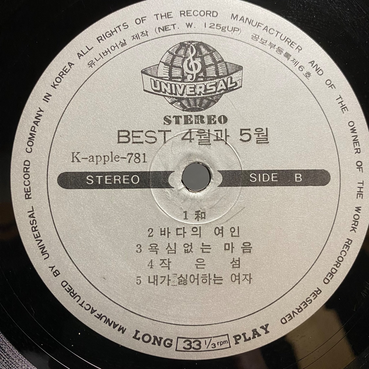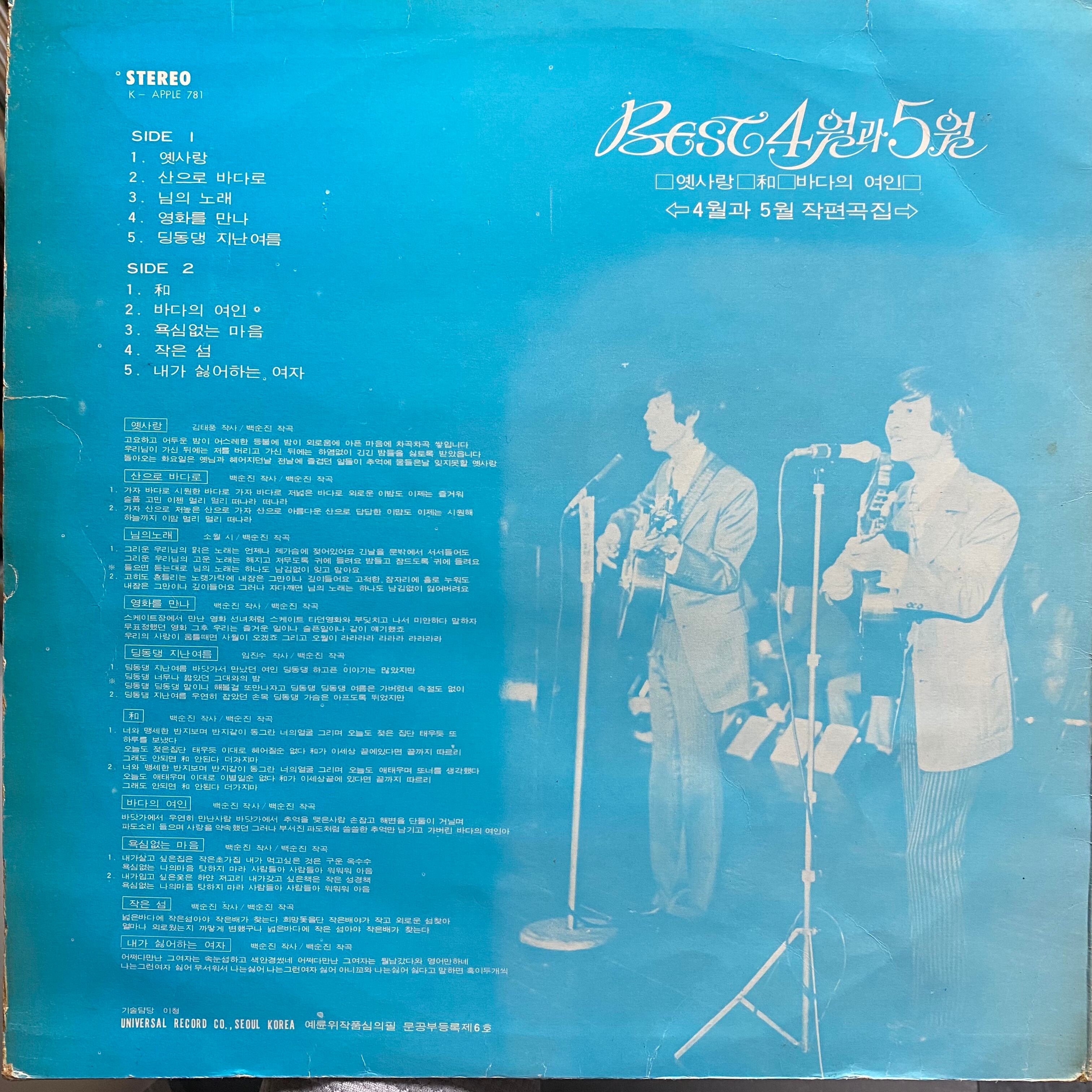 Comment : 韓国シンガーソングライター第一世代ペクスンジンとキムテプンが結成したフォークデュオ April & Mayによる76年ベストアルバム。彼らの代表曲A2“和=화”,A6“ヨンファルルマンナ(영화를 만나)”をはじめ、ドープなサイケフォークA1“イェッサラン(昔の愛)”, A3”イメノレ(貴方の歌)“等収録。