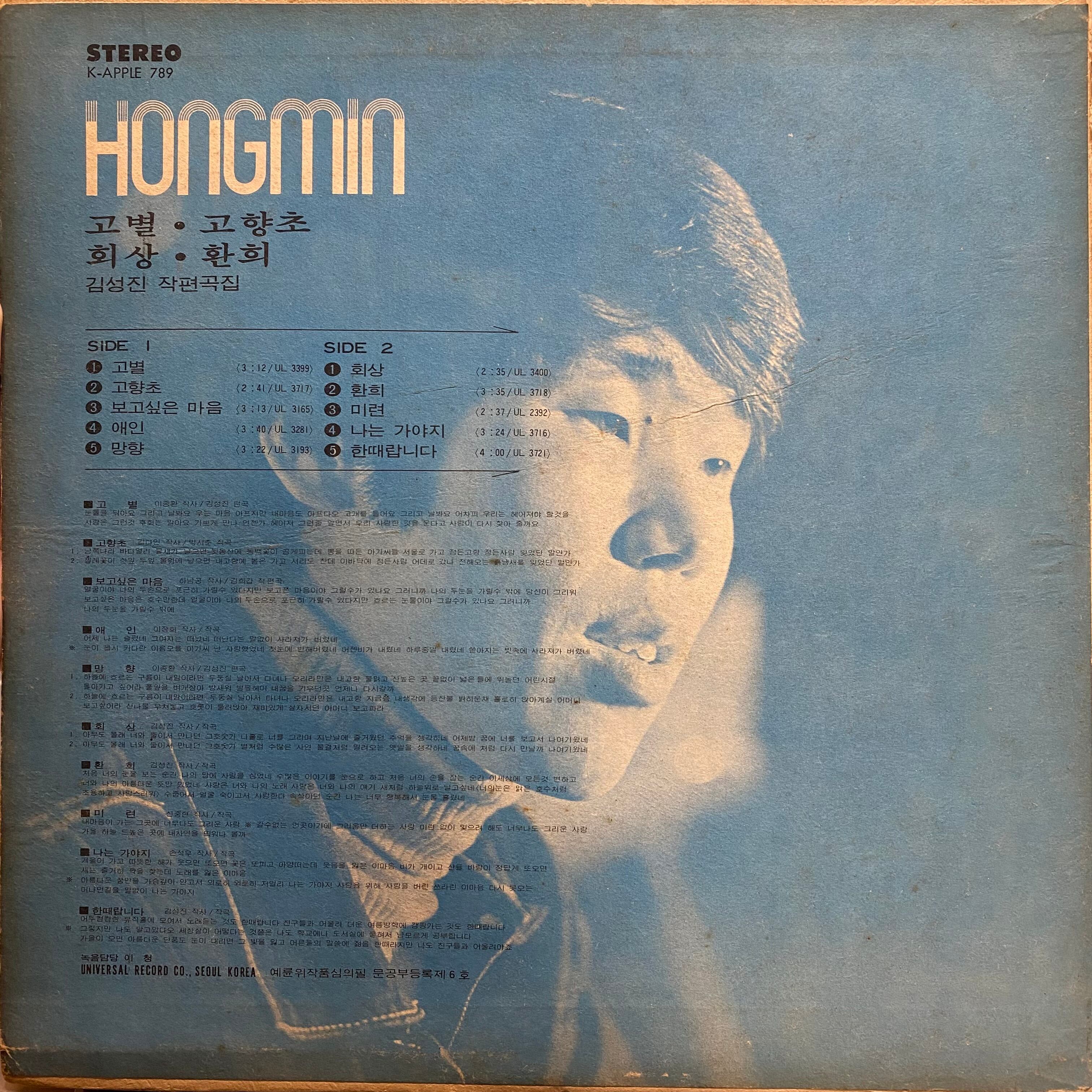 Comment : 韓国の男性フォークシンガー ホンミンの76年リリースグレイテスト・ヒッツ。彼のヒットチューンA1“コビョル(告別)”はじめA2“コヒャンチョ(ふるさと)、シンジュンヒョンによる名曲B3“ミリョン(未練)”を収録。白眉はフィナーレを飾るサイケデリックロックB5”ハンッテラムニダ(一度なんです)“、韓国語歌詞もナイス。後半にナイスドラムブレイク入ってます!
