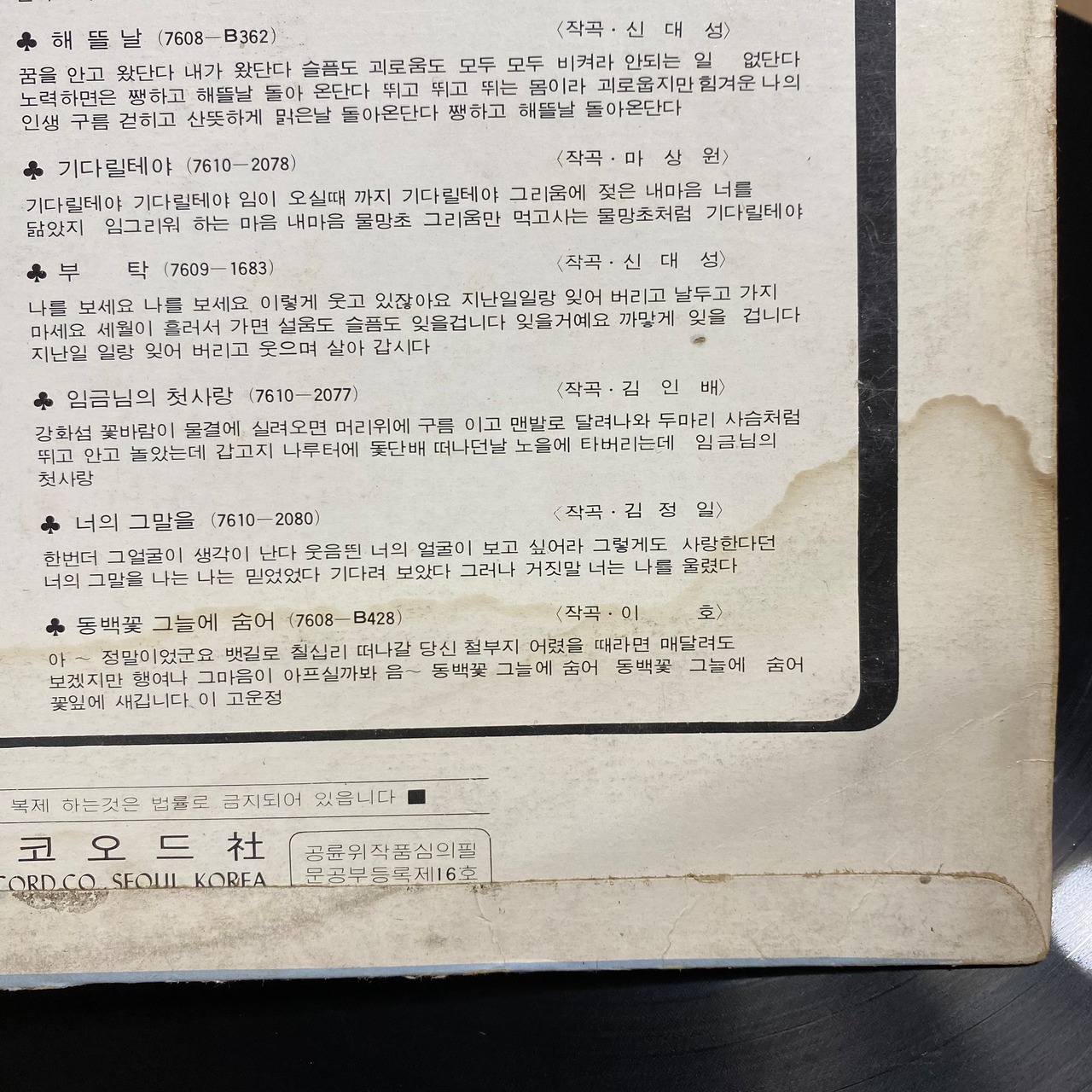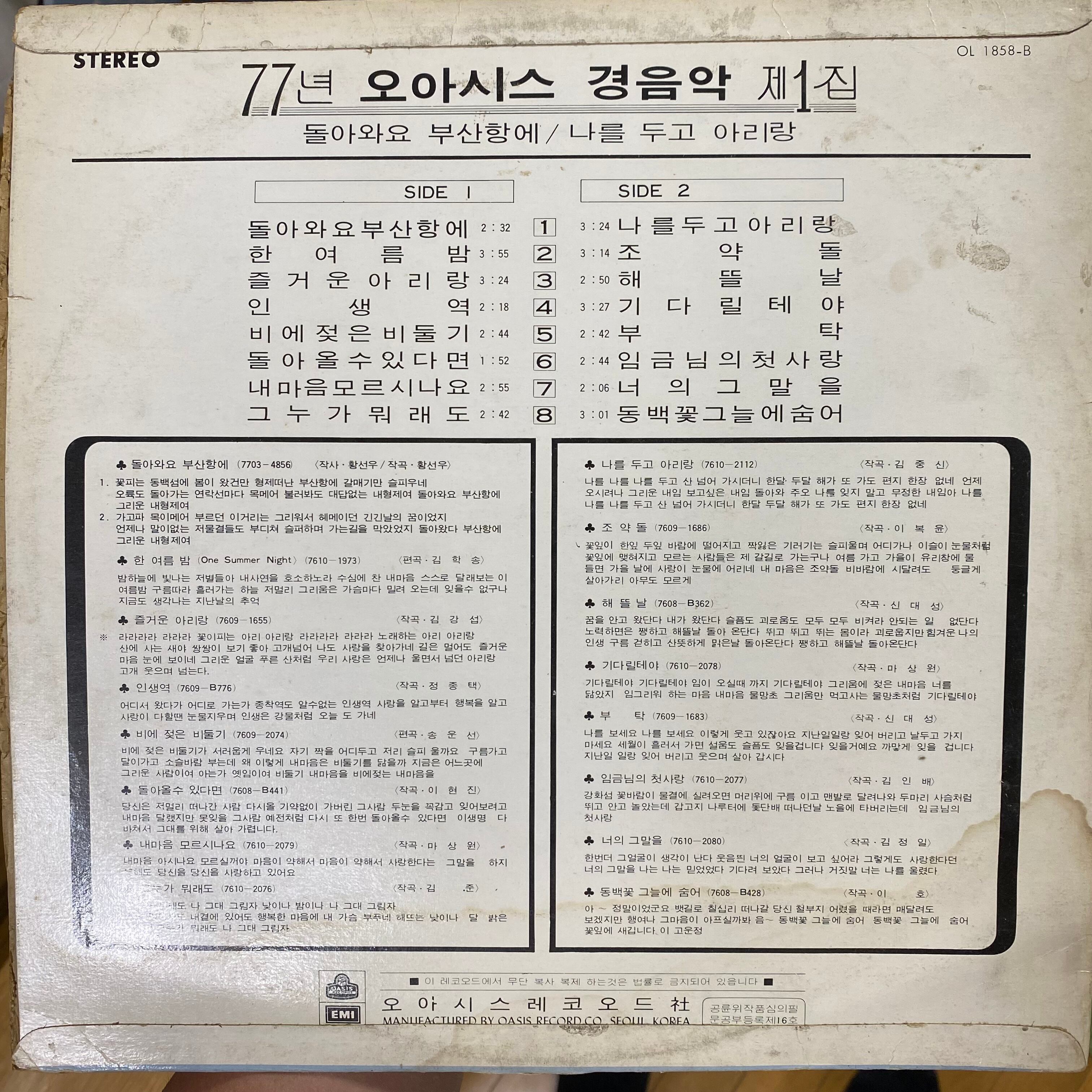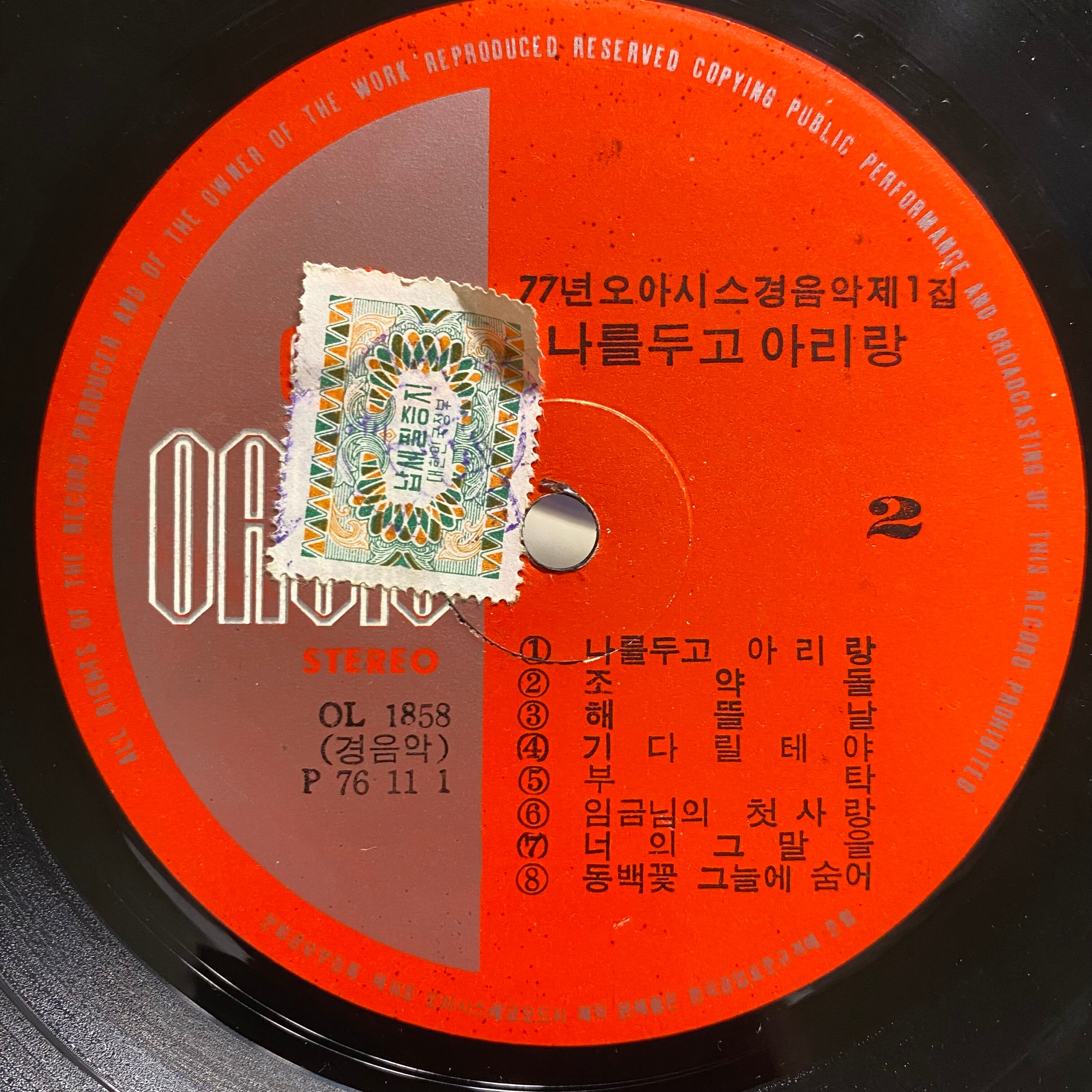 Comment : オアシスレコード専属楽団によるヒット歌謡インスト集。ファンキーグルーヴB2”ジョヤットル(小石)“、ソンデグァンのスローファンクカヴァーB5”プタク(お願い)”、こちらもソンデグァンのカヴァーB3”ヘットゥルラル(陽が昇る日)”、ドラムブレイクがイントロに入ったB7“ノエクマルル(貴方のその言葉を)等、全体を通してファンキーな歌謡カヴァーを多数収録。
