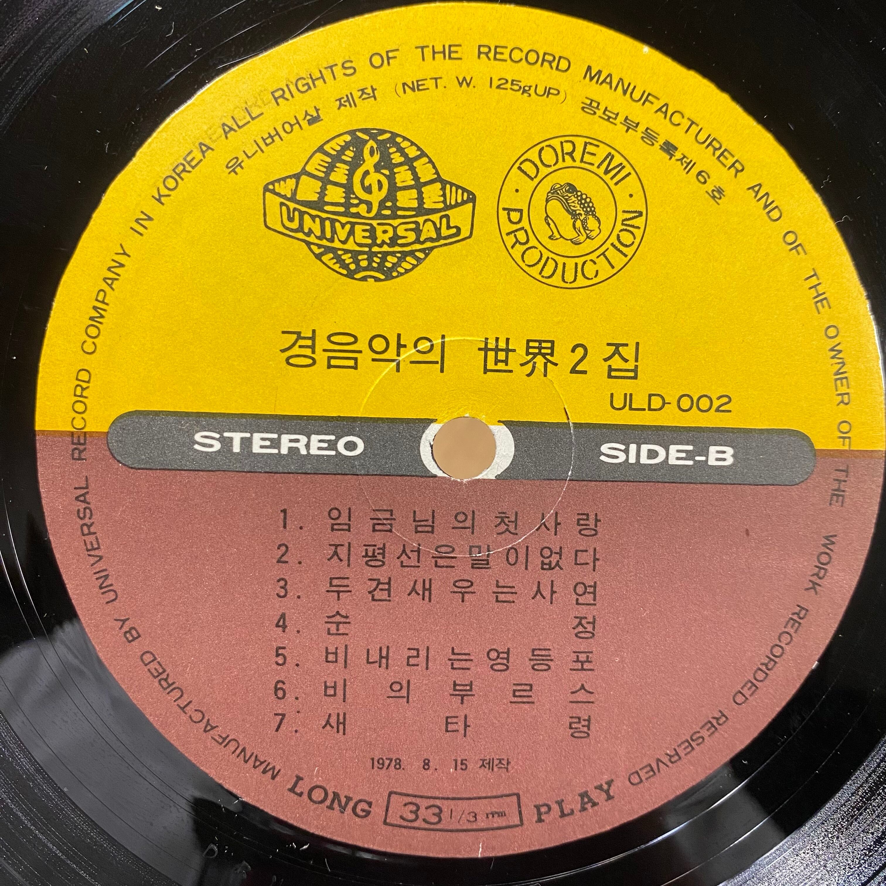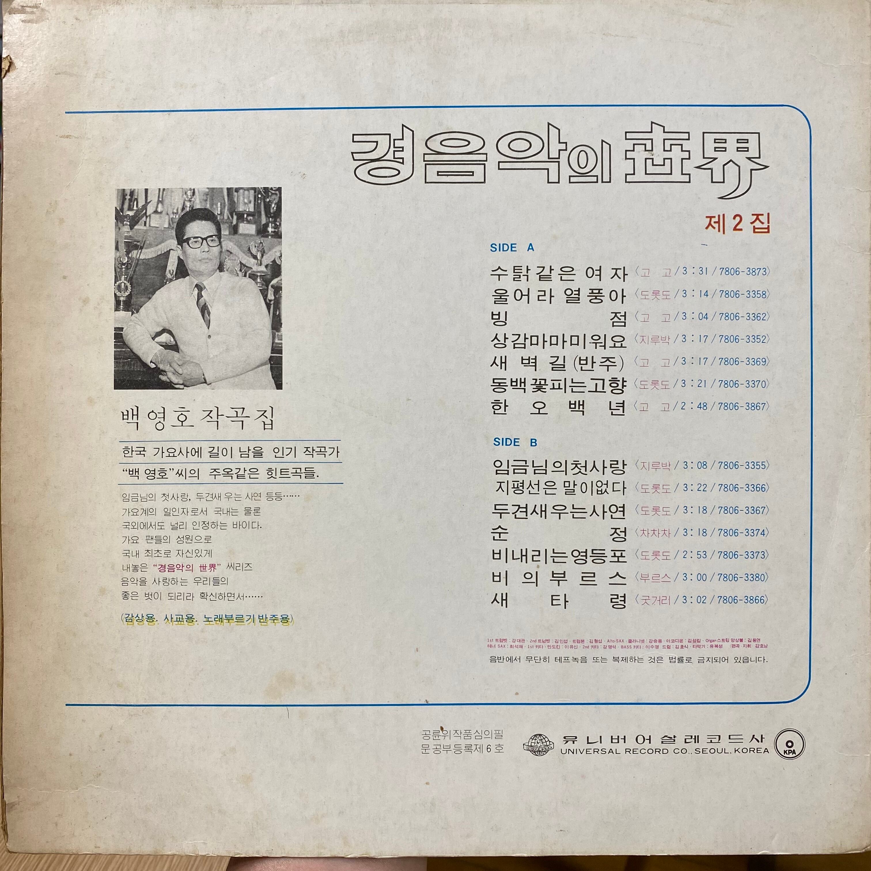 Comment : ユニバーサルレコード専属楽団による70年代ヒット歌謡曲カバー集!シリーズものとして3種類リリースされており、本作は第2集となります。べクヨンホ氏のアレンジによるアップテンポなGo Go/Funk歌謡収録。ドラムブレイク収録のA1、A3がオススメです。