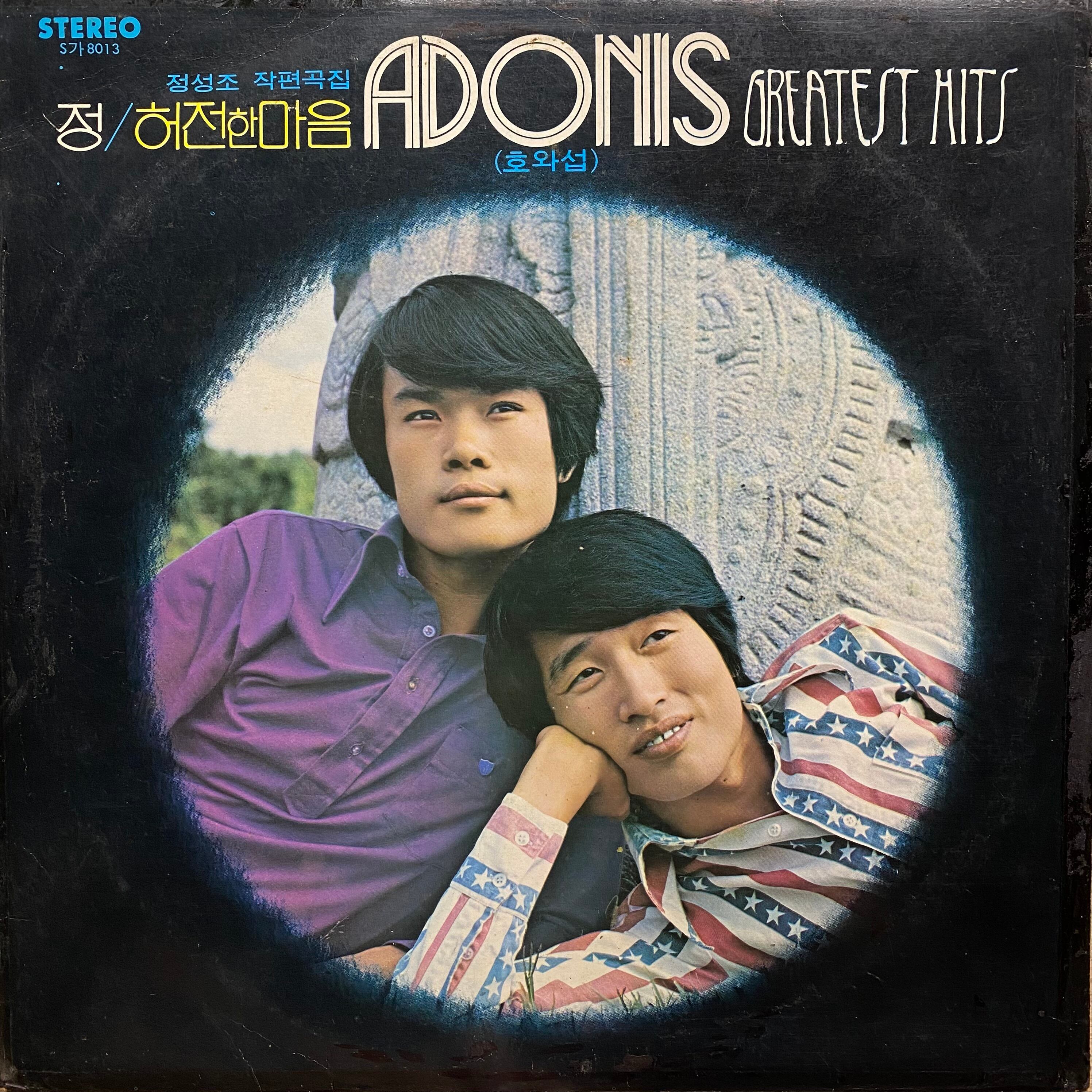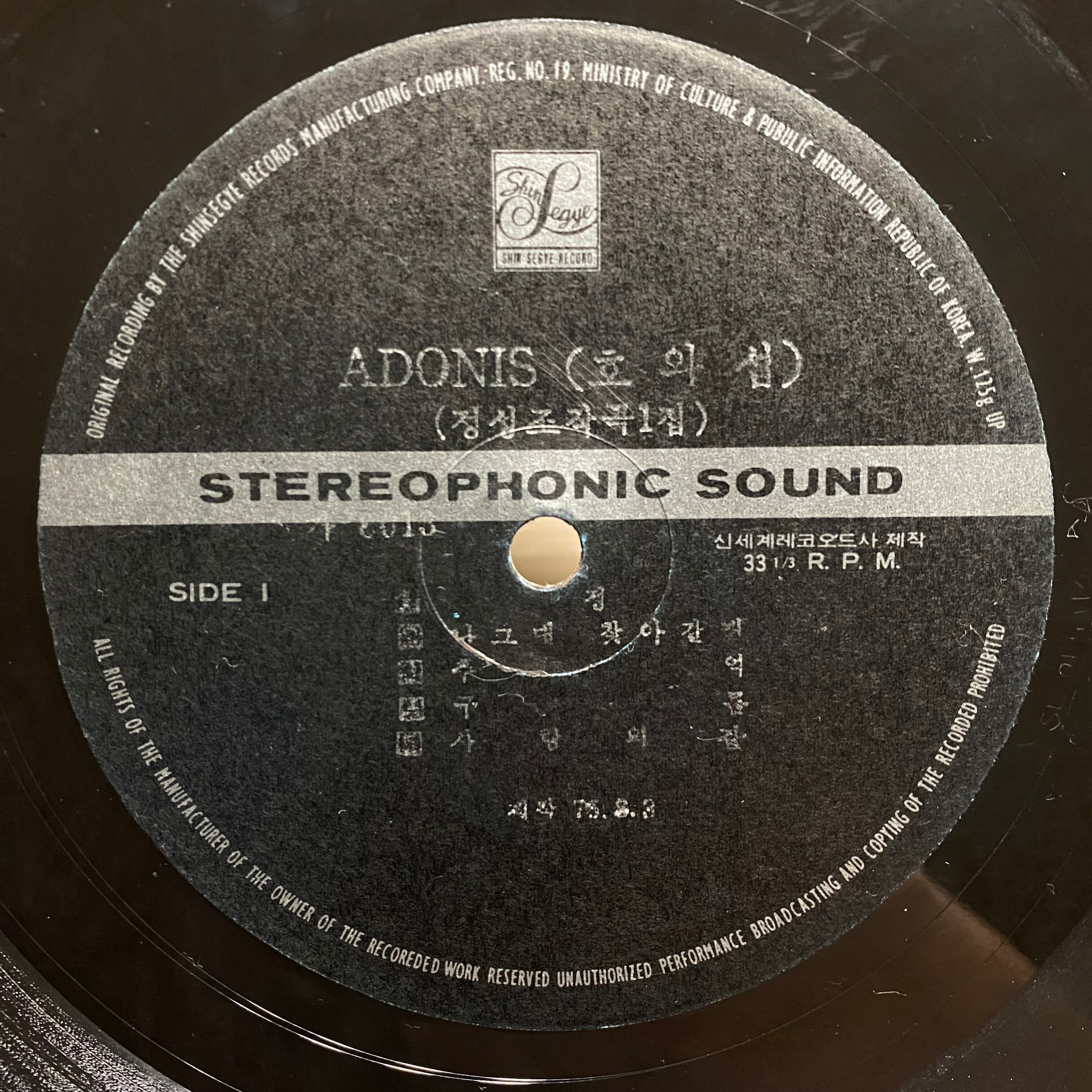Comment : キムホソンとパクジンソプが結成した韓国フォークデュオ ADONISによる75年作。(76年当時の2nd Press)本作は敏腕作編曲家・フルート奏者のジョンソンジョがプロデュースし、A1“ジョン(情)”が韓国大衆歌謡として人気を博しました。ファンキーフォークB1“ホジョンハンマウム(虚しい気持ち)”浮遊感あるギターイントロのメローフォークA4“雲(グルム)”をはじめドープトラックA3“チュオッ(追憶)”等収録。