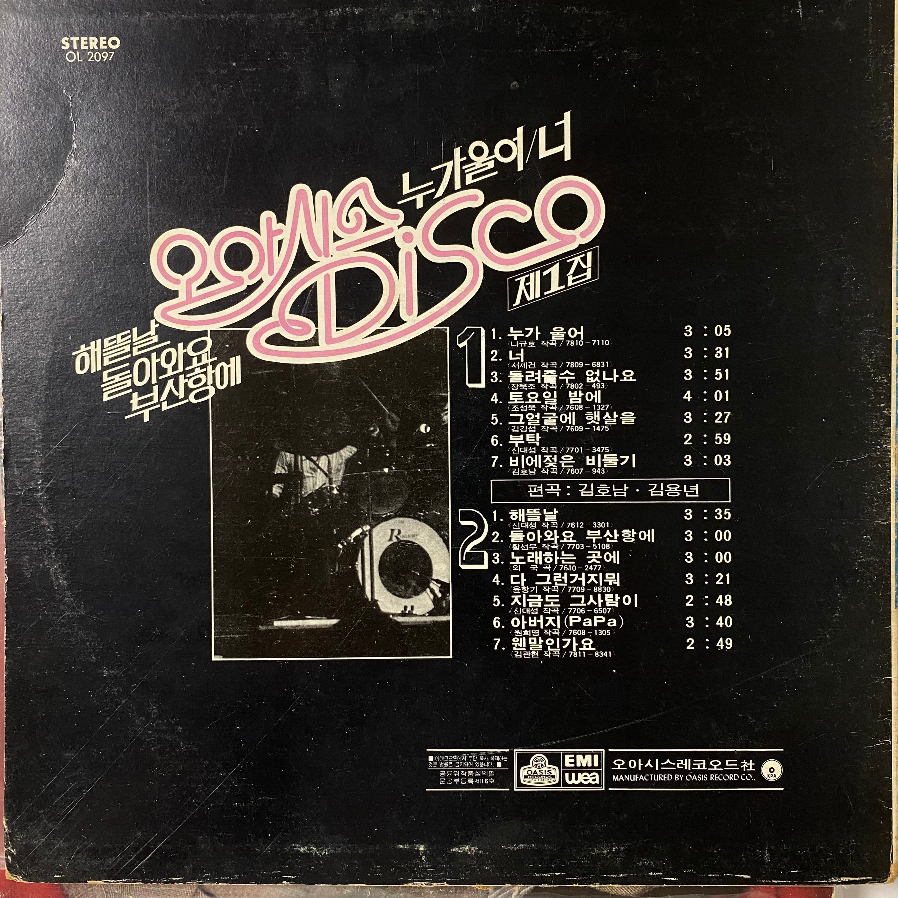 Comment : オアシスレコード専属楽団によるヒット歌謡曲のディスコファンクカヴァー集。ソンデグァンの大ヒットチューンでイントロと中盤にドラムブレイクが入るB1”ヘットゥルラル(太陽が昇る日”のディスコカヴァー、此方も彼のヒットチューンにしてコリアンファンク名曲、A6”プタク(お願い)”のパーカッシヴなディスコファンクカヴァーを収録。軽音楽の中でも見ない作品です。A1は韓国のDJ Soulscape氏がミックスでも使用しておりました。