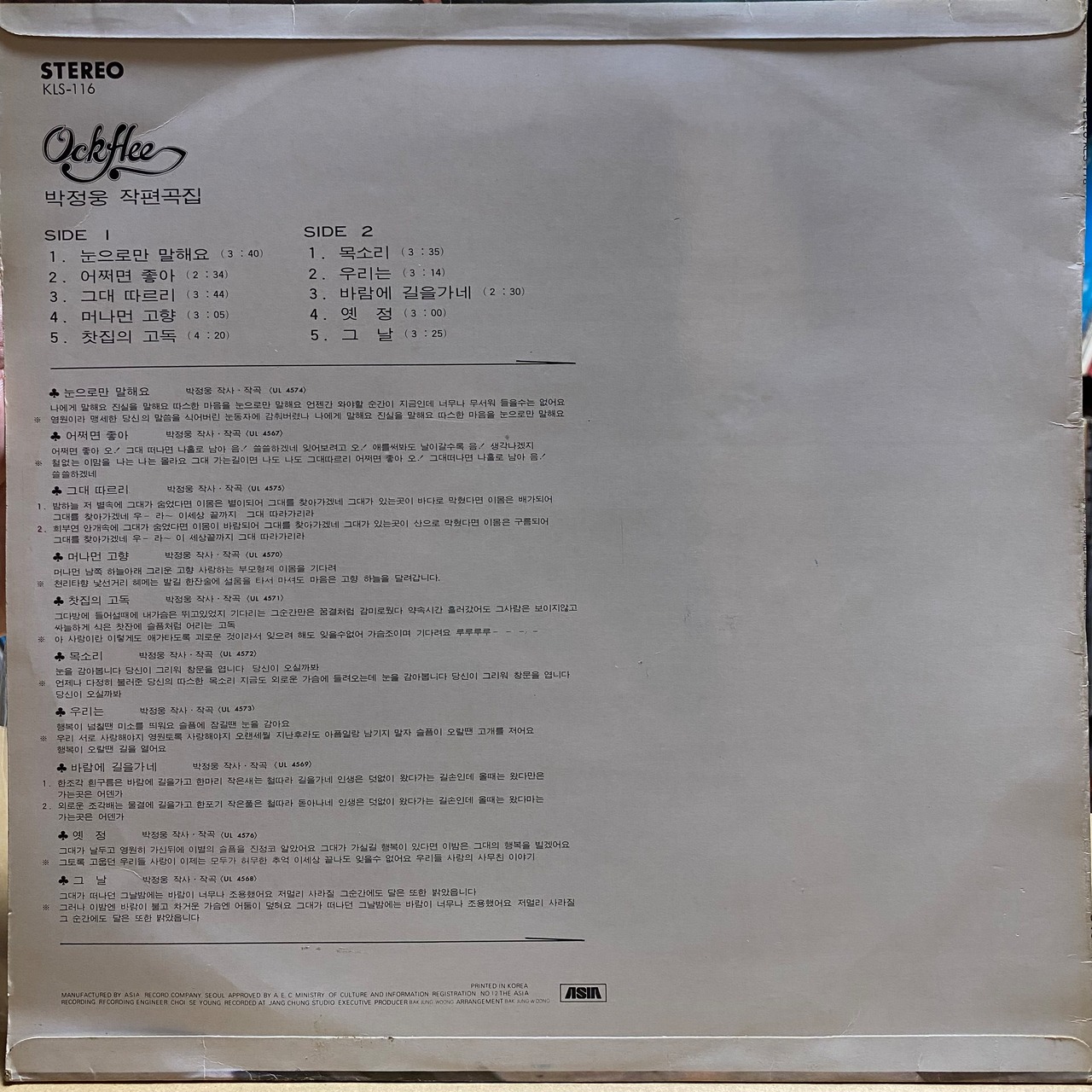 Comment : 70-80年代に活躍した韓国フィーメルシンガー オキの75年作。イントロと中盤ににドラムブレイクを収録のコリアンファンク超クラッシックB1“オッチョミョンチョア(もしかしたら好き)”を収録の名盤!!
